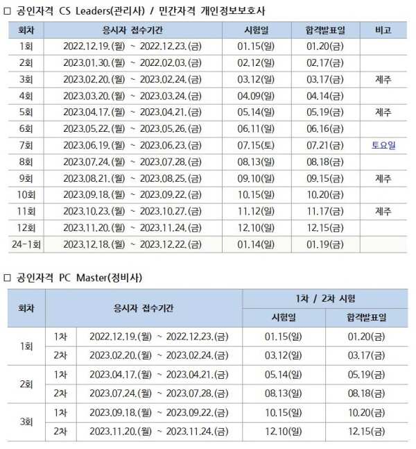 국가공인 민간자격 CS Leaders(관리사), PC Master(정비사) 및 등록민간자격 개인정보보호사를 운영하는 (사)한국정보평가협회에서 2023년 자격검정 시행계획을 발표했다.