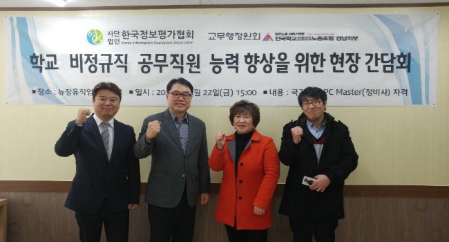 ‘학교 비정규직 공무직원 능력향상을 위한 간담회’를 주제로 김해지역에서 진행된 간담회에는 (사)한국정보평가협회 자격검정부 김민수 부장, 경남 교무행정원회 최둘자 회장, 뉴장유직업전문학교 황용해 학교장외 관계자등이 참여했다.