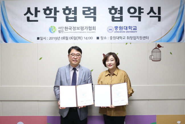 (사)한국정보평가협회와 중원대학교 취창업지원센터는 2019년 08월 06일 오후 02시 중원대학교 취창업지원센터에서 산·학 경쟁력 강화를 위한 양해각서(MOU)를 체결하고, CS 교육과정 개발과 취업역량 강화를 위하여 상호 협력하기로 12일 밝혔다.