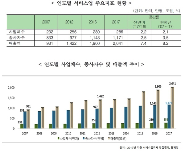 그 결과 2017년 기준 서비스업 사업체수는 286만 3천개, 종사자수는 1,171만 4천명으로 전년에 비해 각각 2.2%(6만 2천개), 2.5%(28만 4천명) 증가하였다. 또한 매출액은 2,041조원으로 전년에 비해 7.4%(141조원) 증가하였으며, 사업체당 매출액도 7억 1천 3백만원으로 전년보다 5.1%(3천5백만원) 증가하는 등 부진한 제조업과는 달리 서비스업이 성장한 것을 볼 수 있다.