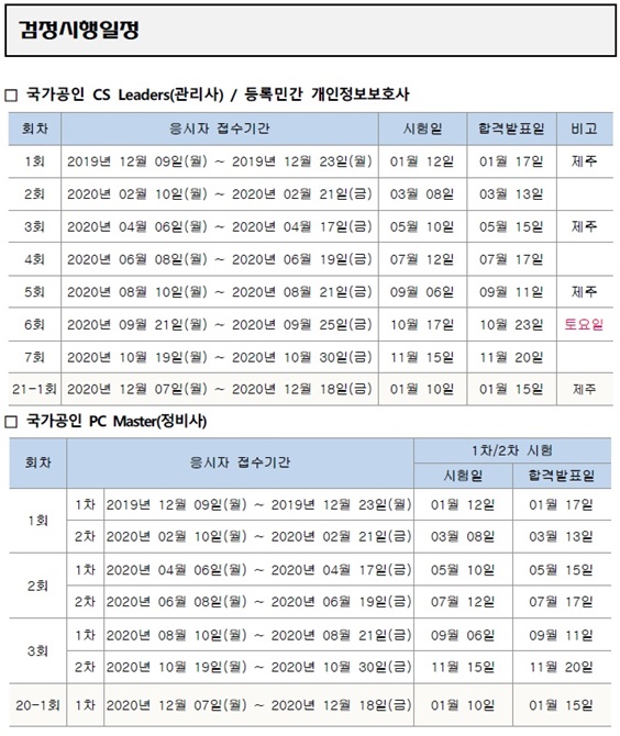 (사)한국정보평가협회에서는 “국가공인 CS Leaders(관리사)와 등록민간자격인 개인정보보호사의 경우 각각 7회와 6회의 시험이 예정되어 있으며, 국가공인 PC Master(정비사)는 총 3회에 걸쳐 진행될 예정”이라고 밝혔다.